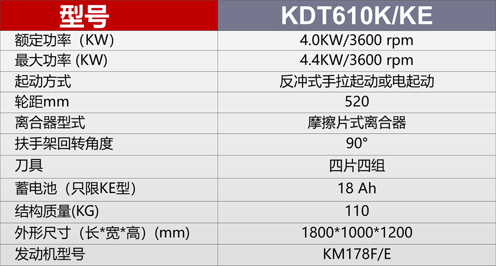 型号:KDT610K/KE 功率:4.4KW/6HP 发动机型号:M178F/E