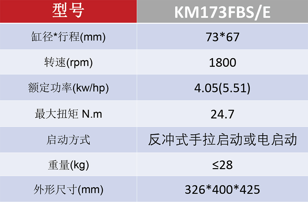 型号:KM173FBS/E 功率:4.05KW/ 5.51HP 排量:0.28L