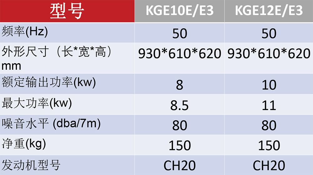 型号:KGE10E/E3 功率:8KW 发动机型号:CH20