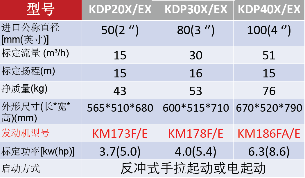 型号:KDP30X/EX 功率:4.0KW 发动机型号:KM178F/E