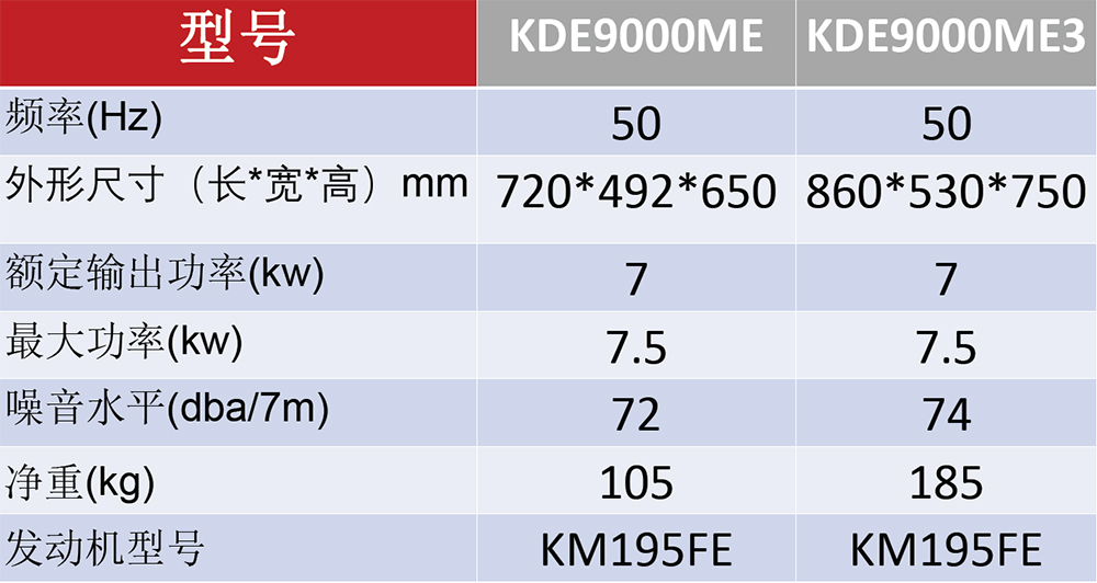 型号:KDE9000ME 功率:7KW 发动机型号:KM195FE