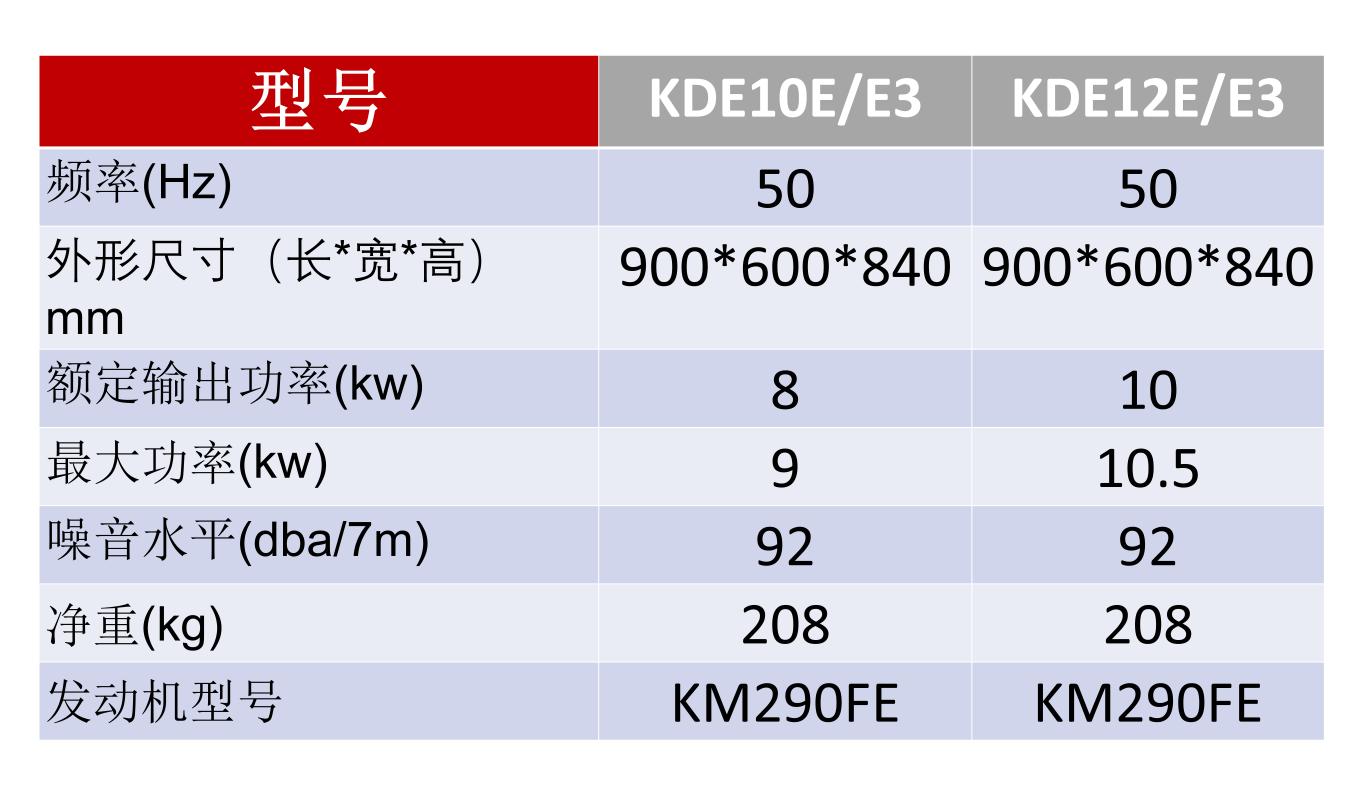 型号:KDE10E/E3 功率:8KW 发动机型号:KM290FE